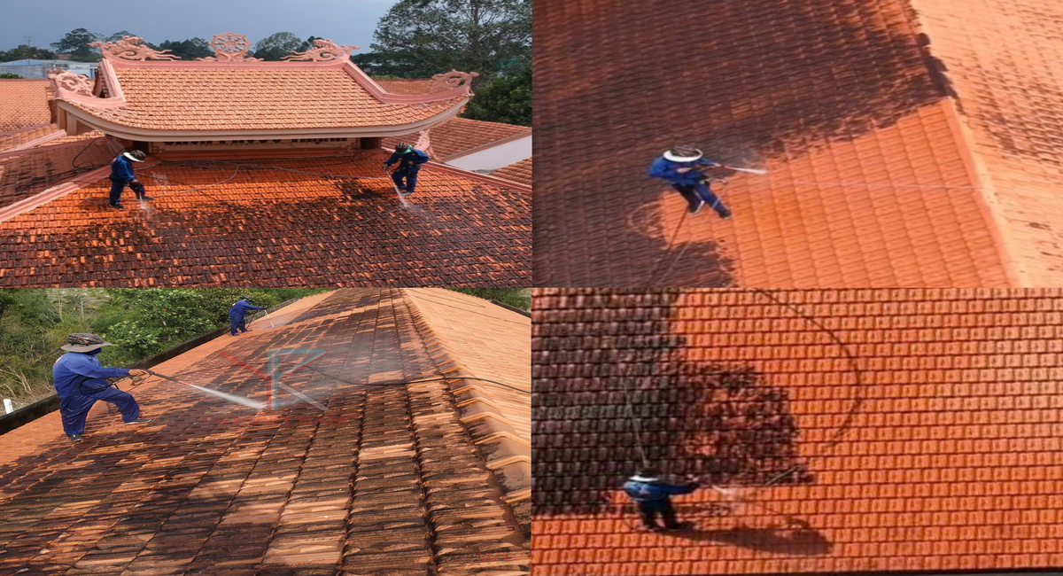 + Rửa sạch rong: dùng máy áp lực xịt trực tiếp lên mái nhà, rửa sạch rong, công đoạn này rất khó khăn vì đảm bảo sạch rong, vừa đảm bảo di chuyển an toàn trên mái ngói, vừa không cho nước vào trong mái nhà (công việc này dành cho nhân viên đã được đào tạo)